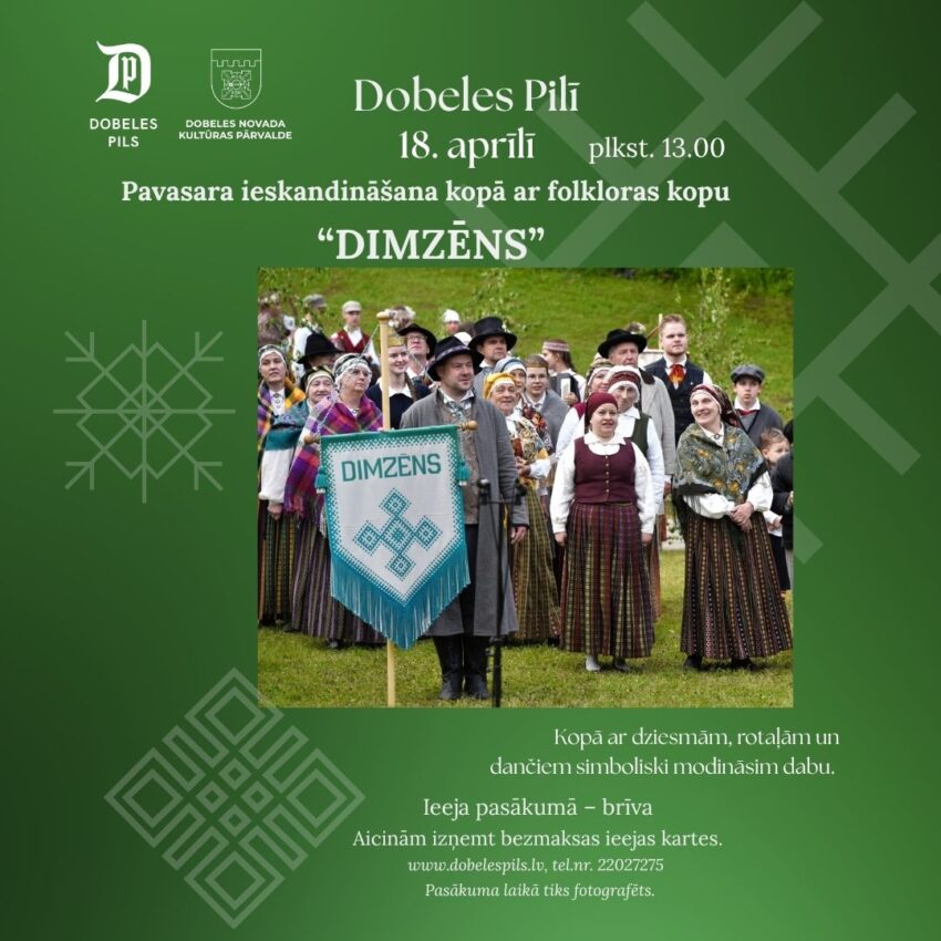 Folkloras kopa “Dimzēns” aicina uz pavasara ieskandināšanu Dobeles pilī 18. aprīlī plkst. 13.00. Kopā ar dziesmām, rotaļām un dančiem simboliski modināsim dabu un pavasari. Tā būs iespēja ne tikai klausīties, bet arī iesaistīties – dziedāt līdzi un piedalīties kopīgās rotaļās un dančos.